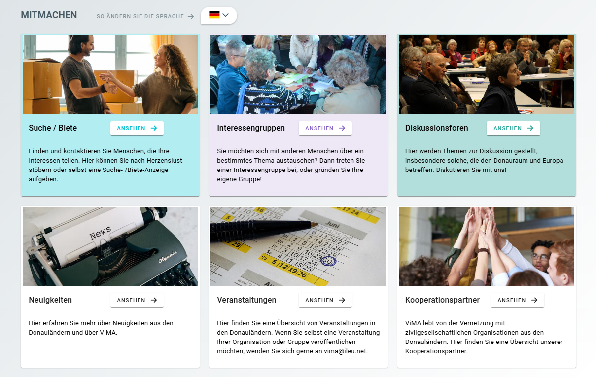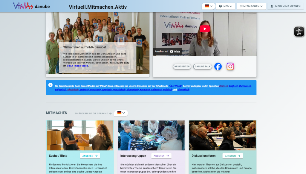 Egal ob Sie Menschen kennenlernen, eine Sprache üben, Projekte starten oder einfach neue Perspektiven aus anderen Ländern entdecken möchten – ViMA Danube ist der digitale Treffpunkt für Offenheit, Vielfalt und internationales Engagement. Probieren Sie es aus: www.vima-danube.eu.