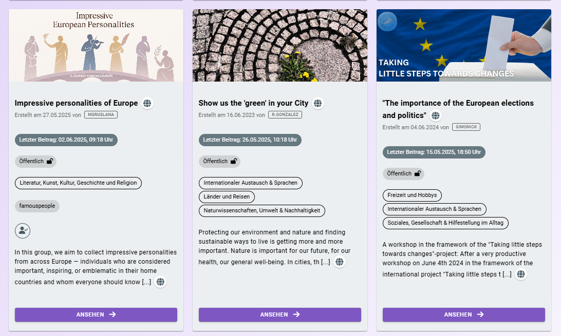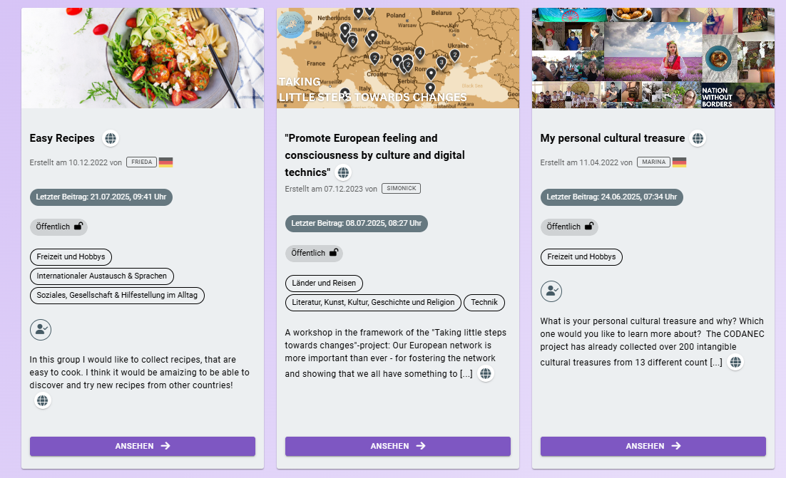 Die Plattform lädt Menschen jeden Alters ein, sich unabhängig von ihrer Herkunft oder Sprachkenntnissen zu beteiligen. Über die Bereiche „Suche-Biete“, Interessensgruppen und thematische Projektgruppen können Nutzer:innen Kontakte knüpfen, an länderübergreifenden Aktivitäten teilnehmen und neue Perspektiven kennenlernen. Besonders beliebt ist die Möglichkeit, sich in eigenen Interessengruppen und kulturellen Projekten zu engagieren oder Sprachpartner:innen zur gegenseitigen Unterstützung zu finden.